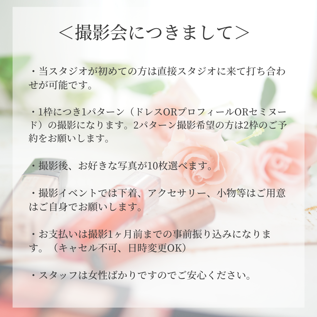 宣材写真、ドレス、セミヌードからお好きな撮影が選べます!